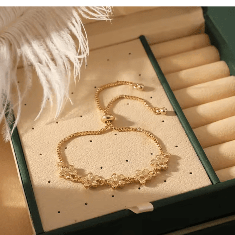 Laissez votre style s'épanouir avec ce Bracelet avec Fleurs en or plaqué 14 carats. Les détails floraux délicats donnent au bijou une allure ludique et féminine – un hommage à l'élégance et à la beauté naturelle. Parfait pour tous les jours ou comme geste romantique.